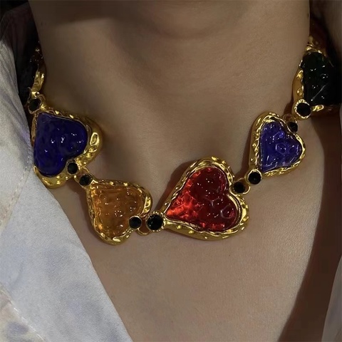 ヴィンテージカラフルな樹脂ハートアイスアウトステートメントネックレスファッションジュエリー点滅クリスタルチョーカーネックレス女性用